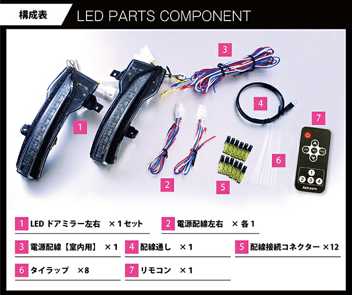 キット内容 ・LEDドアミラー本体 1セット ・本体用電源配線 1セット ・室内用電源配線 1本 ・配線通し 1本 ・配線接続コネクター 12個 ・タイラップ 8本 ・リモコン ※年式・グレードによっては装着できないことがありますので、 万が一、取り付けにできない場合は弊社までお問い合わせください。